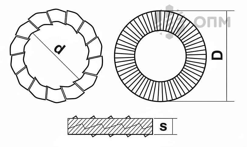 Шайба стопорная ОПМ 104047 — это крепежный элемент, предназначенный для предотвращения ослабления резьбовых соединений, вызванного вибрациями и динамическими нагрузками. Конструкция состоит из двух шайб с зубчатой поверхностью, которые работают совместно для создания фиксации за счет взаимодействия между собой и резьбой болта или гайки. Принцип действия основан на создании бокового давления, что исключает вероятность самопроизвольного откручивания даже при длительной эксплуатации.