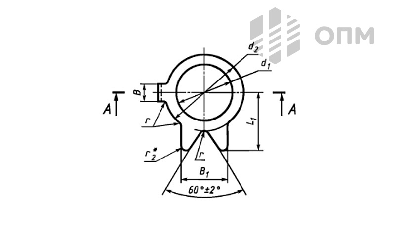 | Номинальный диаметр резьбы d | d₁ B12 | d₂ | B h14 | B₁ h14 | L js15 | L₁ js15 | L₂ js15 | s | r | r₁ | r₂ | Несимметричность носка и лапок, относительно осей d₁ не более |