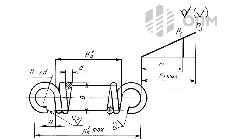 | Обозначение пружины | P1, Н (кгс) | P2, Н (кгс) | D, мм | d, мм | H0, мм | Hmax, мм | F1, Н | Fmax, Н | Число рабочих витков n | a, мм | r, мм | Длина L, мм |